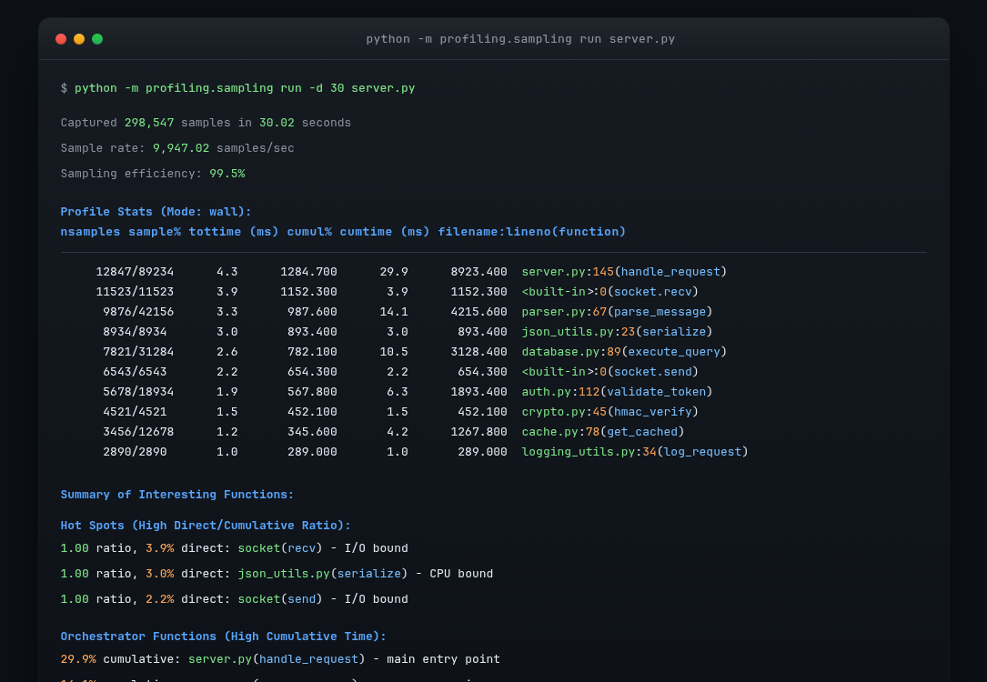 The sampling profiler is designed for production use. It imposes no measurable overhead on the target process because it reads memory externally rather than instrumenting code. The target application continues running at full speed and is unaware it is being profiled.